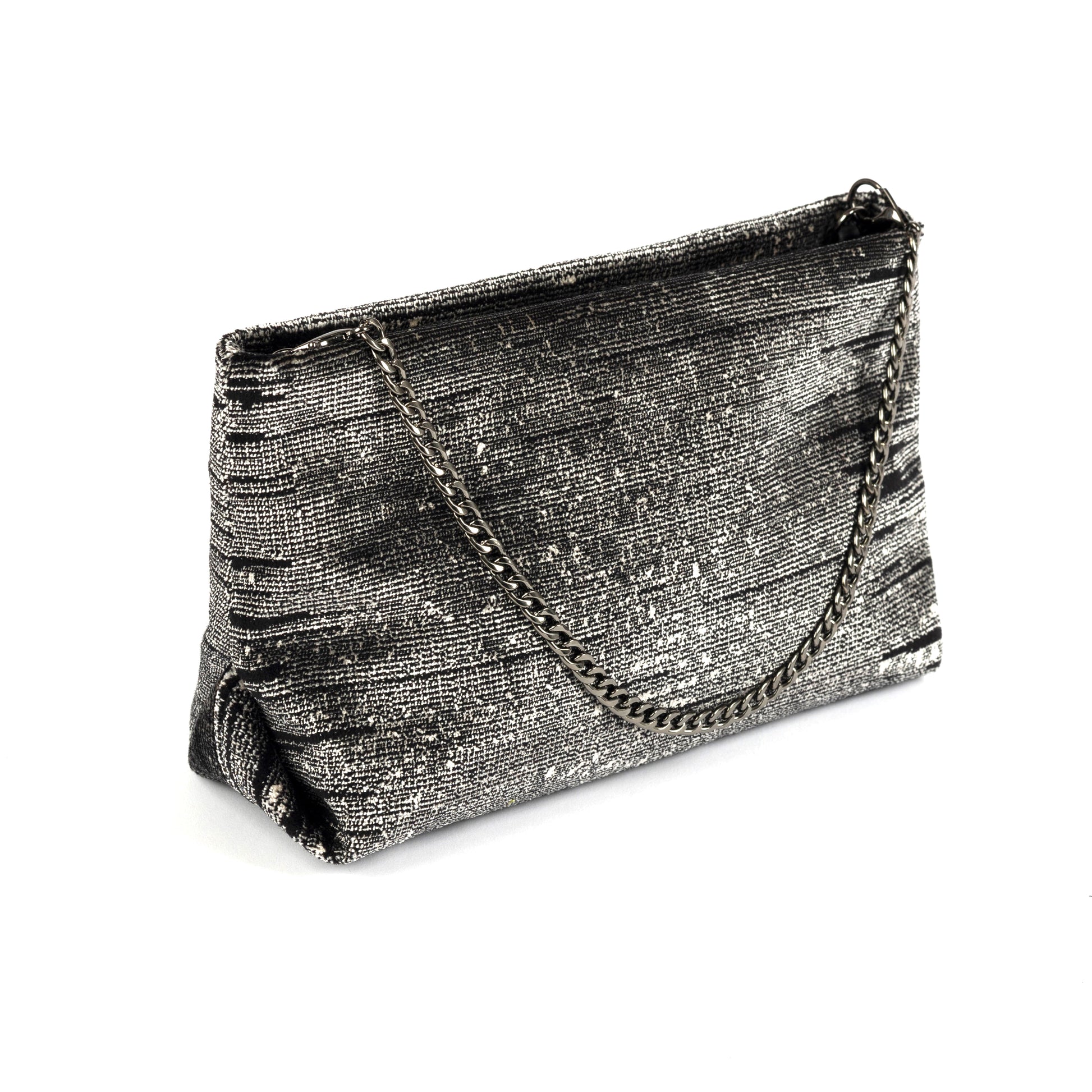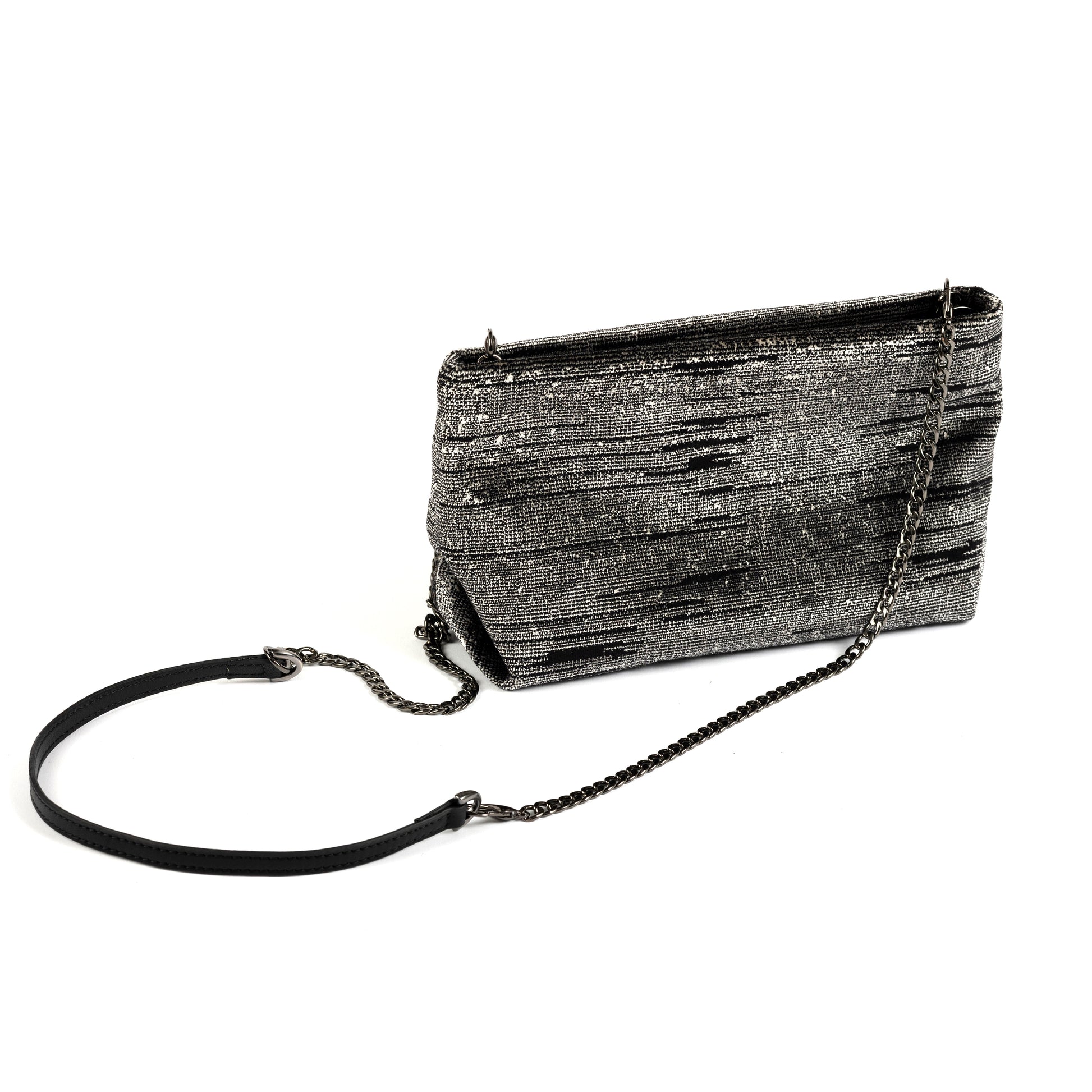 Turn heads with the sophisticated Blenheim clutch in shimmering silver and black velvet.