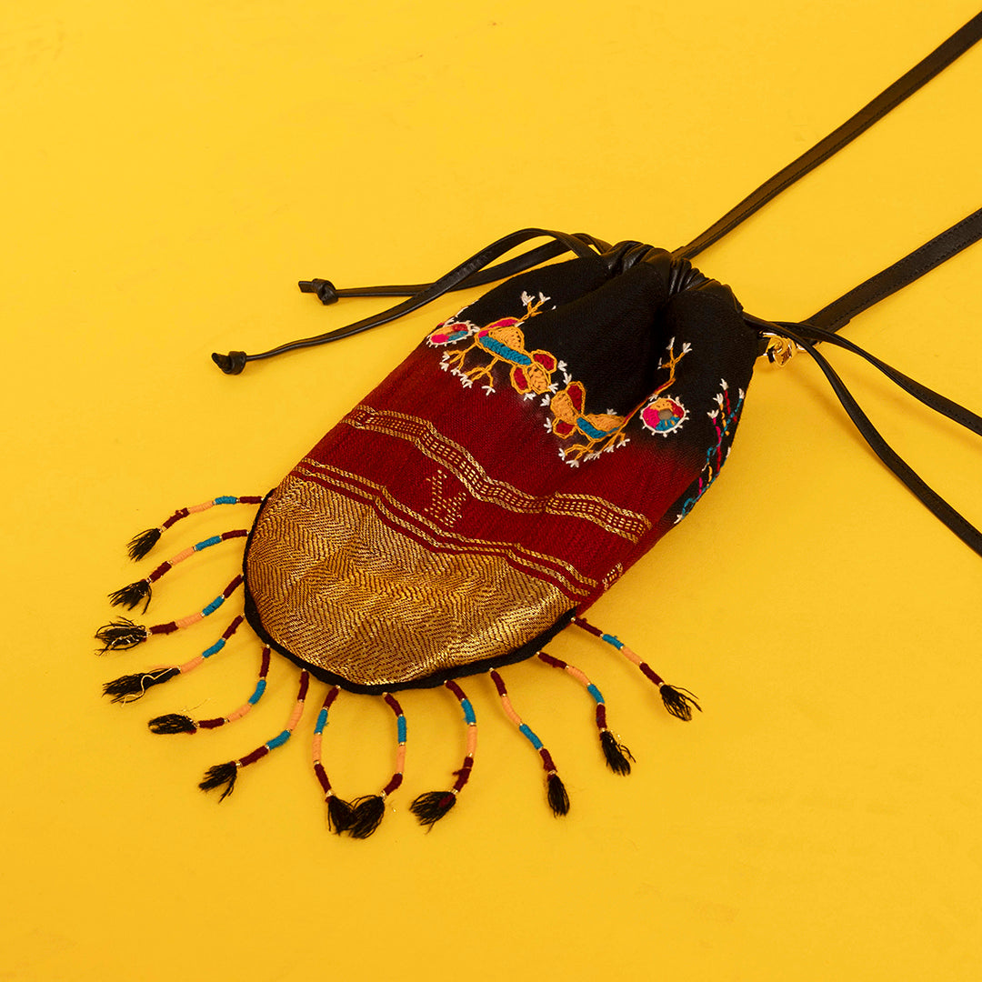 The Islington drawstring pouch blends stunning traditional craftsmanship with everyday practicality. A detachable leather cross-body strap allows easy hands-free movement, while the drawstring fastening opens to reveal a tangerine-hued interior with plenty of space for all your daily essentials. Beautifully decorated with gold stripes and whimsical peacock hand embroidery, it’s finished with a tassel trim integrated from the original vintage shawl fabric - ideal for adding a splash of vibrancy to any outfit.